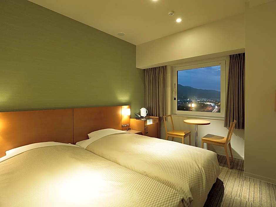 This twin room features 2 single beds that are aligned together (total 87 in wide). There is an electric kettle and air conditioning in this room.